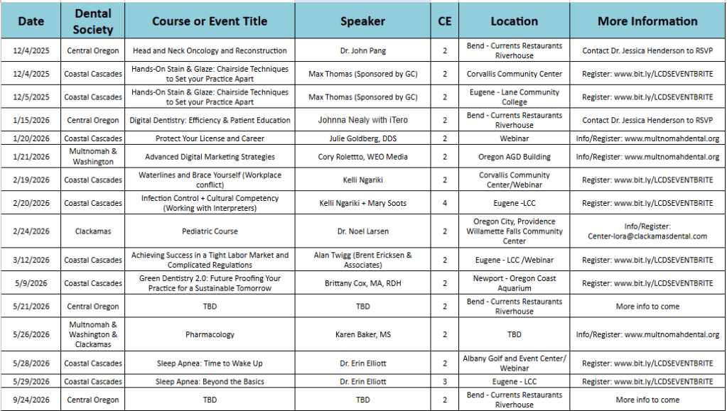 December 11, 2025 Oregon Dental Hygiene Association High Desert Component CE Event